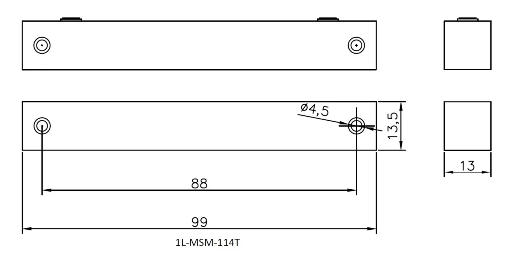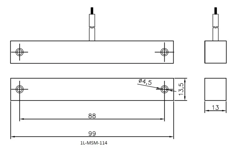 1L-MSM-114 – Wide Gap Magnetic Reed Switch Home / 1L-MSM-114 – Wide Gap Magnetic Reed Switch Datasheet & Application Guide: 1L-MSM-114 Wide Gap Reed Switch Model No. 1L-MSM-114 Variants of 1L-MSM-114:1L-MSM-114 NO1L-MSM-114T NO Download Cataloge Technical Specifications: Switch Type (1L-MSM-114)NONOVoltage200 VDC200 VDCCurrent0.5 A0.5 APower10 W10 WOperating Gap (min.)5050Dimensions (LxWxH)99 x 13.5 x 1399 x 13.5 x 13Wire TypePVCTerminal for Connection* Wire Length (std.)*4′N.A.Core Size2 Core 22 AWGN.A.Operating Temp.-20°C to +70°C-20°C to +70°CStorage Temp.-40°C to +85°C-40°C to +85°CHumidityUp to 95% non-condensingUp to 95% non-condensingHousing MaterialABS PlasticABS PlasticMounting TypeScrew MountScrew MountMechanical LifeOver 10 million cyclesOver 10 million cyclesContact Resistance0.1 Ω0.1 ΩHousing ColourGreyGreyWire ColourGreyN.A. 1L-MSM-114 Varients 1L-MSM-114 NO 1L-MSM-114T NO