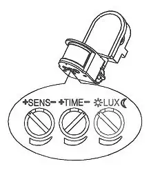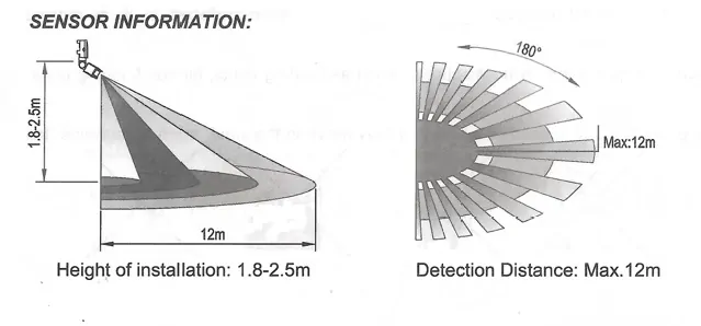 The sensor has an adjustable detection range from 5 meters to 12 meters (at temperatures below 24°C), providing coverage for large areas or different environmental settings.
